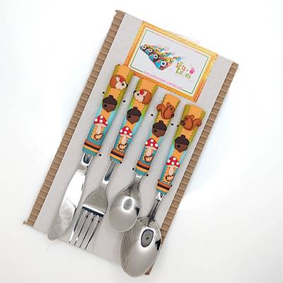 Ensemble de 4 couverts sur le thème des Hérisson dont la taille, la forme et le poids sont adaptés aux mains et à la bouche des enfants.