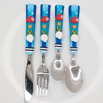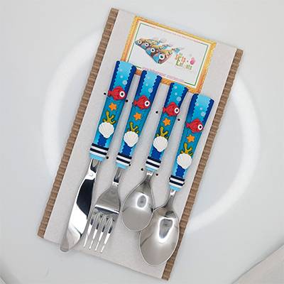 Ensemble de 4 couverts sur le thème de la mer dont la taille, la forme et le poids sont adaptés aux mains et à la bouche des enfants.