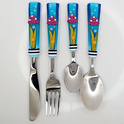 Ensemble de 4 couverts sur le thème de la mer dont la taille, la forme et le poids sont adaptés aux mains et à la bouche des enfants.