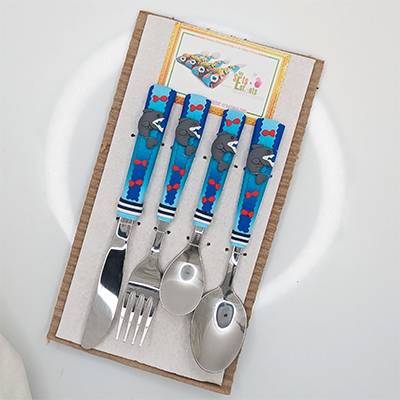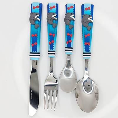 Ensemble de 4 couverts sur le thème de la mer dont la taille, la forme et le poids sont adaptés aux mains et à la bouche des enfants.