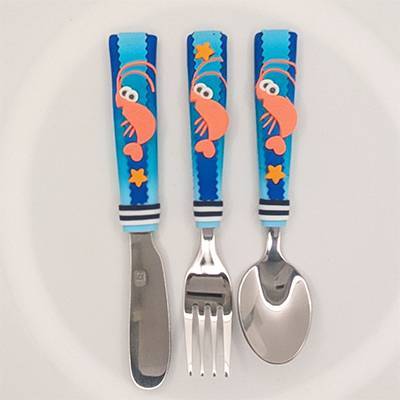 Ensemble de 3 couverts sur le thème des Crevettes dont la taille, la forme et le poids sont adaptés aux mains et à la bouche des enfants.