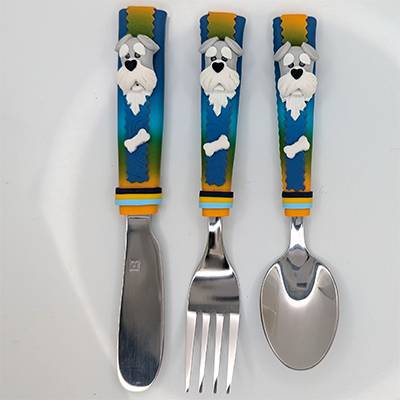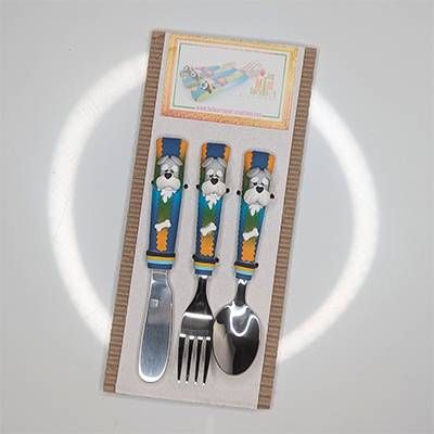 Ensemble de 3 couverts sur le thème des Chiens dont la taille, la forme et le poids sont adaptés aux mains et à la bouche des enfants.