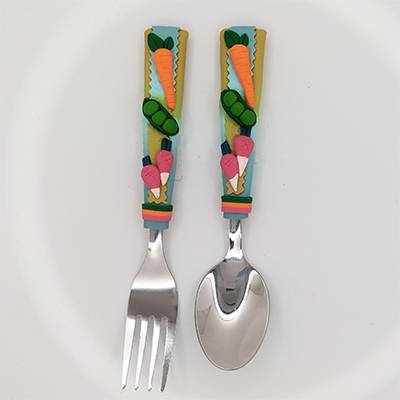 Ensemble de 2 couverts sur le thème des Légumes dont la taille, la forme et le poids sont adaptés aux mains et à la bouche des plus petits.