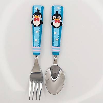 Ensemble de 2 couverts sur le thème des Pingouins dont la taille, la forme et le poids sont adaptés aux mains et à la bouche des plus petits.