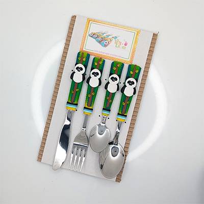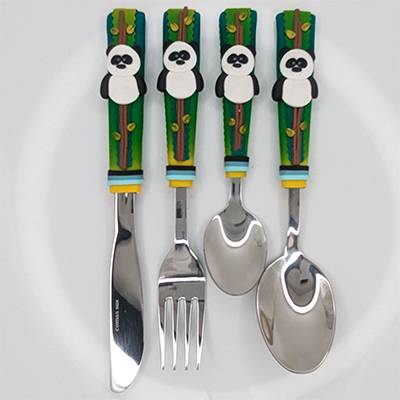Ensemble de 4 couverts sur le thème du Panda dont la taille, la forme et le poids sont adaptés aux mains et à la bouche des enfants.