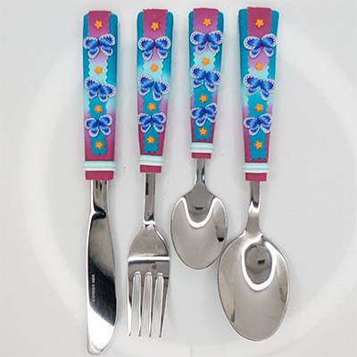 La base des couverts est de qualité inoxydable et polie, le manche est de création artisanale et décoré en pâte polymère.