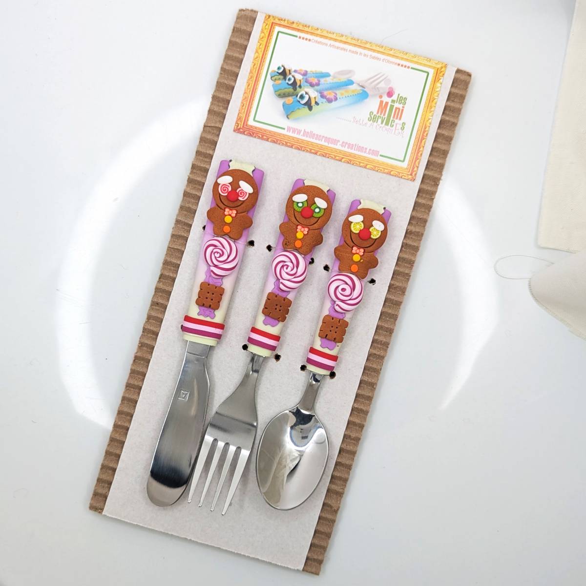 La base des couverts est de qualité inoxydable et polie, le manche est de création artisanale et décoré en pâte polymère.