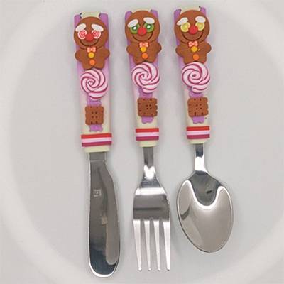 Ensemble de 3 couverts sur le thème de la Gourmandise dont la taille, la forme et le poids sont adaptés aux mains et à la bouche des enfants.