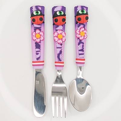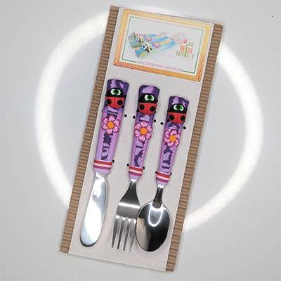 Ensemble de 3 couverts sur le thème des animaux de nos jardins dont la taille, la forme et le poids sont adaptés aux mains et à la bouche des enfants.