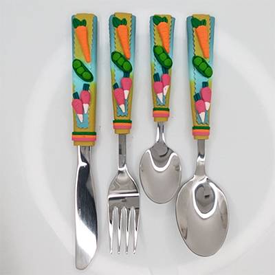 Ensemble de 4 couverts sur le thème du Potager dont la taille, la forme et le poids sont adaptés aux mains et à la bouche des enfants.
