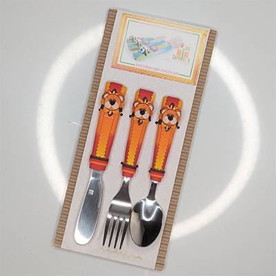 Ensemble de 3 couverts sur le thème de la savane dont la taille, la forme et le poids sont adaptés aux mains et à la bouche des enfants.