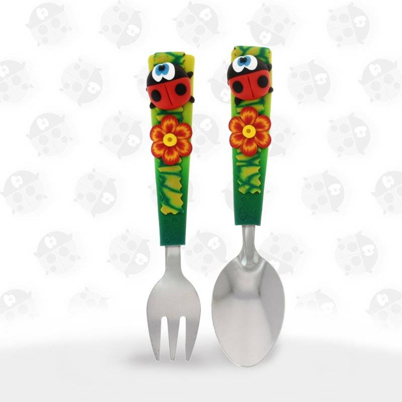 Ensemble de 2 couverts sur le thème des Coccinelles dont la taille, la forme et le poids sont adaptés aux mains et à la bouche des plus petits.