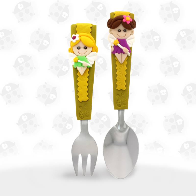 Ensemble de 2 couverts sur le thème des Fées dont la taille, la forme et le poids sont adaptés aux mains et à la bouche des plus petits.