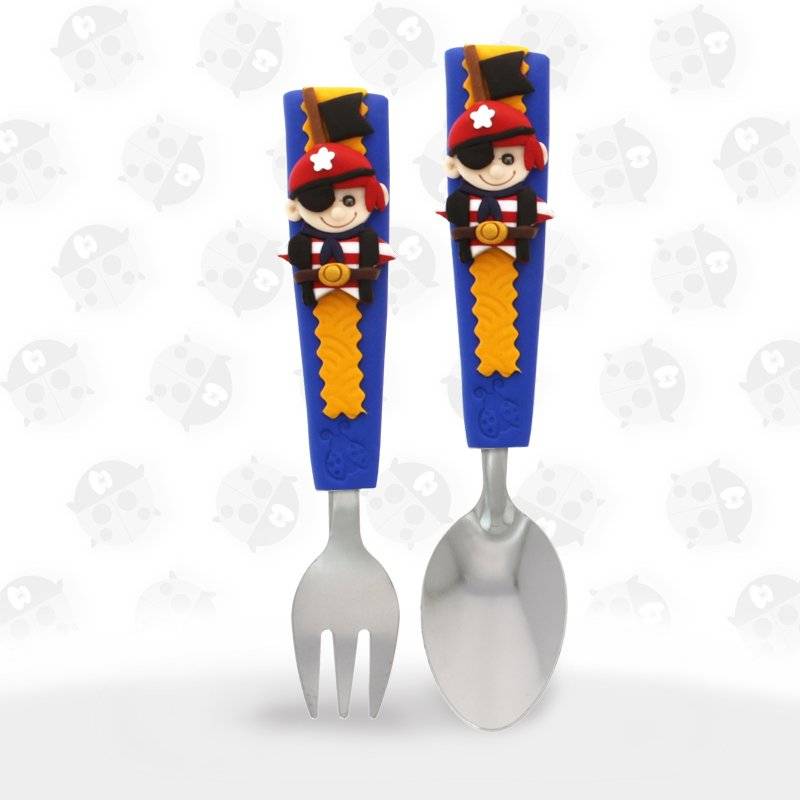Ensemble de 2 couverts sur le thème des Pirates dont la taille, la forme et le poids sont adaptés aux mains et à la bouche des plus petits.