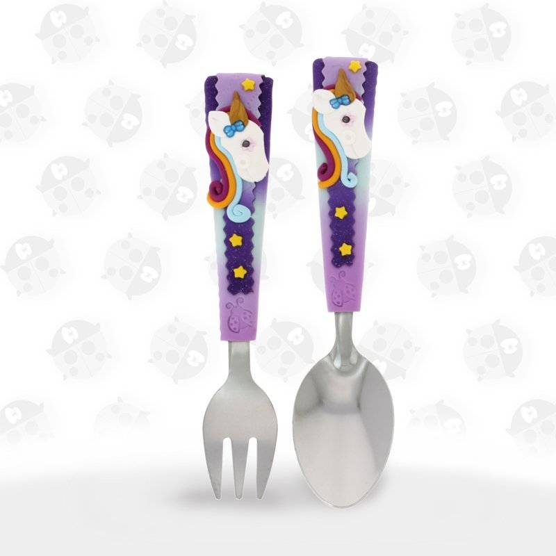 Ensemble de 2 couverts sur le thème des Licornes dont la taille, la forme et le poids sont adaptés aux mains et à la bouche des plus petits.