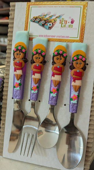 Notre savoir-faire artisanal se met au service de vos envies pour créer des pièces uniques. Imaginez la joie d'un enfant découvrant son propre couvert enfant personnalisé, gravé à son prénom et orné de motifs tendres ou ludiques. Chez Belle à Croquer, chaque couvert enfant personnalisé est pensé avec soin, de la sélection des matériaux (pâte polymère sans phtalate et acier inoxydable durable) à la réalisation à la main en France.